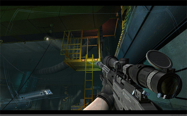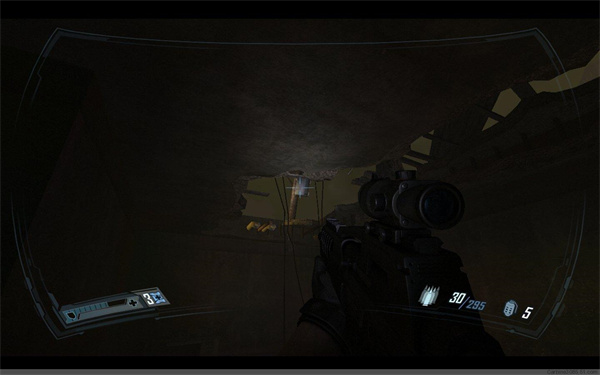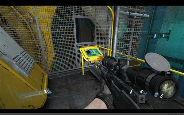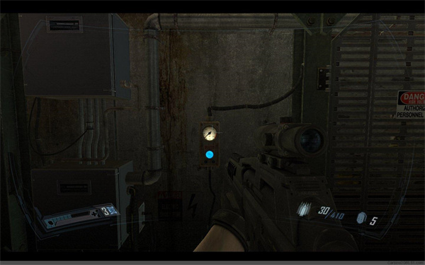 来到另外一个升降平台下,同样降下平台,之后还会有4个左右的隐形兵,小心对付,然后进入亮着白光的房门。之后一路前行,来到一个开关处,换上狙击步枪,启动开关