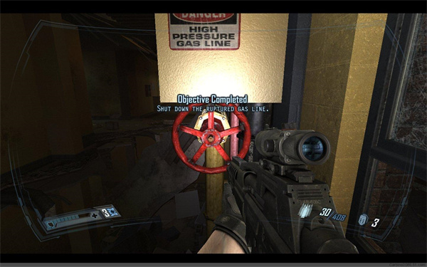 来到一个房间,启动开关打开大门。期间小心对付装备突击步枪的敌人,之后爬过坍塌的屋顶,消灭从装甲车里出来的喷火兵和平台上的敌人,之后爬上平台。再从扶梯出下去,来到一个大通道,继续前进,配合手雷消灭路上的敌人。由于战斗,爆炸的煤气管道封住的上行的扶梯,找到阀门关闭煤气
