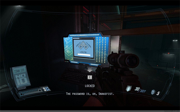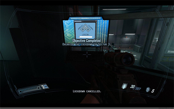 电梯下行来到地下实验室,出了电梯后,右转来到控制室,启动电脑,解锁门禁