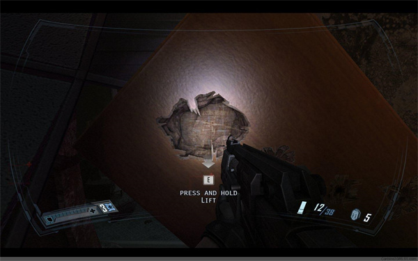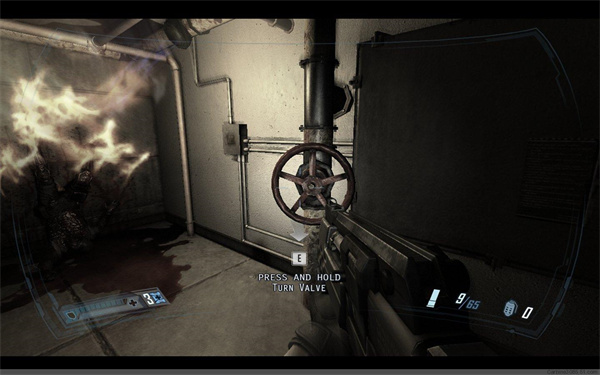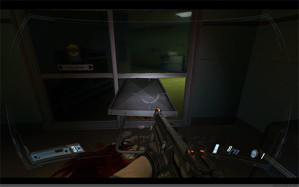 干掉敌人的喷火兵,顺着地下的血迹前进。穿过手术室,看到敌人似乎在和什么东西交战,同样一路按照血迹前行,最后来到电梯处启动电梯,从电梯出来后来到一个环形手术大厅,这时你会被一个怪物袭击,这种怪物比较头痛,身轻体快,而且近身攻击力颇高,最好的办法是用霰弹枪配合子弹时间近距离轰杀。消灭4~5只怪物后继续前进。踢开卡住自动门的手术台