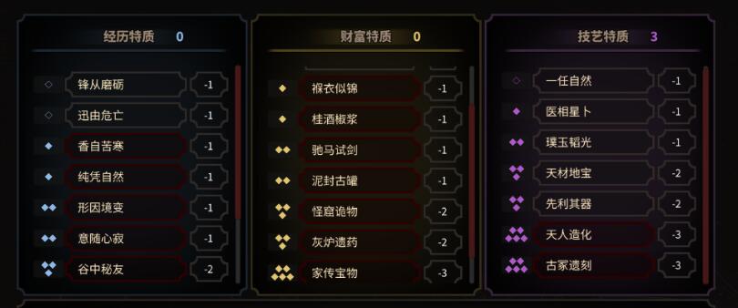 琴棋书画:提高音律弈棋诗书绘画资质 需要前置技艺0 消耗1点特质点数