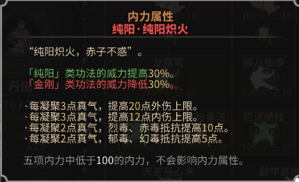纯属性内力提高本属性功法威力30%,降低主属性所克制属性功法30%威力