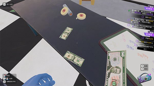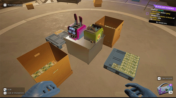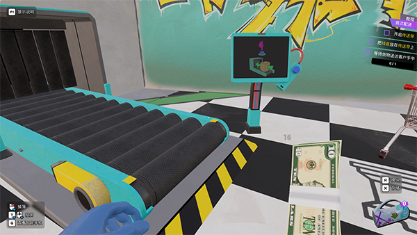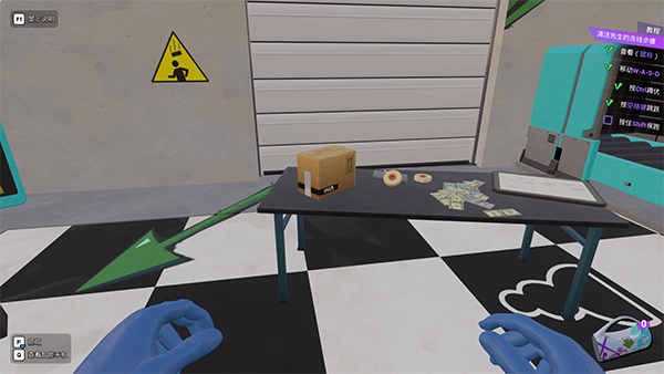 8、一开始玩家只需要对着货币按着鼠标左键,接着在胶带按E,之后放进箱子里即可。
