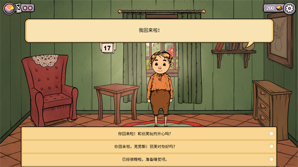 这个时候玩家要保持耐心,准备好足够的食材和家务活,保证在孩子拒绝互动的时候有事情可以做来消耗行动机会,以此推进游戏剧情的发展,防止因为无事可做导致游戏进程卡死,如果实在没有食材可以做饭或者没有衣服可以补的话,可以出门去湖边钓鱼,去森林采蓝莓和蘑菇。
