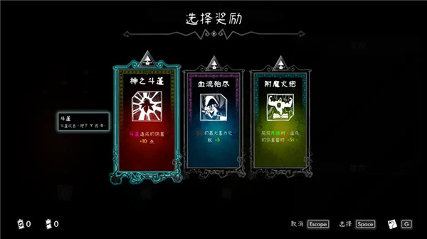 4、前期奥杀一般给出3个可选天赋,后期会变成5个,部分诅咒会附带debuff,在选择该诅咒后必须在给出的两个debuff中选一个(建议优先增加怪物血量的,也就多来一刀的事)。