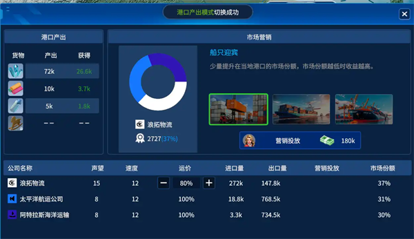 港口的海运需求并非被我们一家垄断,有其他商业竞争对手。投放营销广告、降低运价打价格战,商战开始了。现实里美团、淘宝、京东外卖大战,游戏里有海运巨头混战。不断地提高市场占有率,获得更多运输订单。