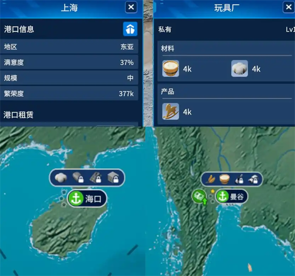 游戏并非单一的倒买倒卖,还需要建立起产业链。上海产的一件玩具,有来自曼谷海参崴的橡胶,有来自基隆海口的棉花。满足港口的需求,提高繁荣度,不断解锁更高级的产业。