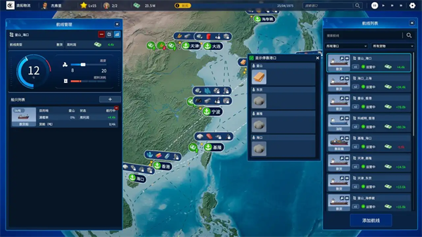 游戏有港口产出、港口需求和产业需求三种视图切换,更方便地查看各个港口港口的供需情况。点击某一货物,即可查看紧缺该货物的城市。本质上,这是款和面模拟器。货多加船加增运速,货缺加港口增市占率。