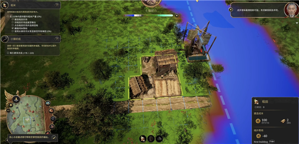 6、接下来需要增加粮食产量,先放置一些稻田,绿色代表肥力,越浅肥沃度越高。