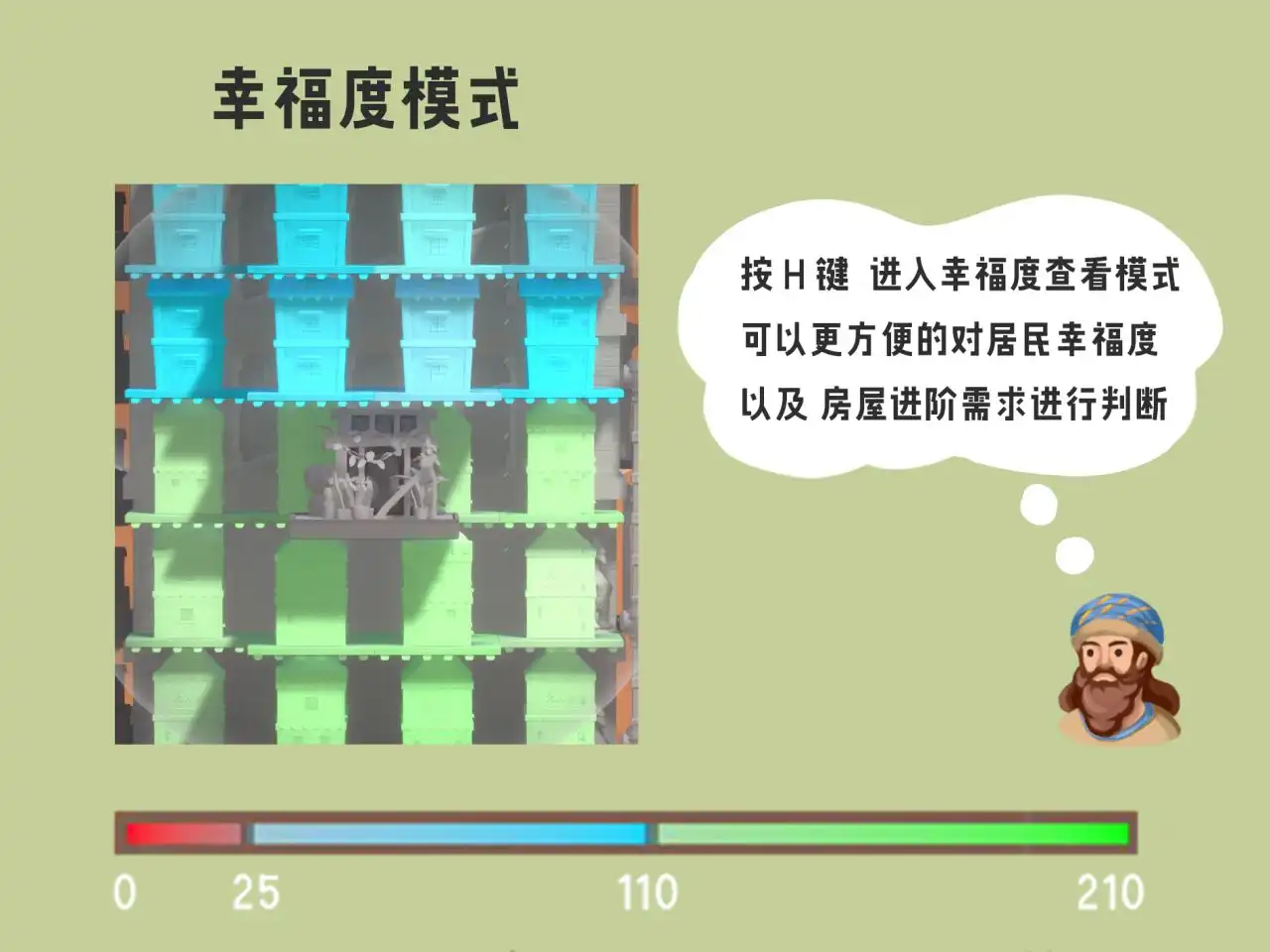 当某位居民的幸福度达到升级标准时,整栋房屋都会从简陋的棚屋升级为坚固的砖房,容纳更多人口(2 → 3),通勤范围也会从上下 2 层拓展到上下 4 层,为塔的建设提供更高效的人力支持。
