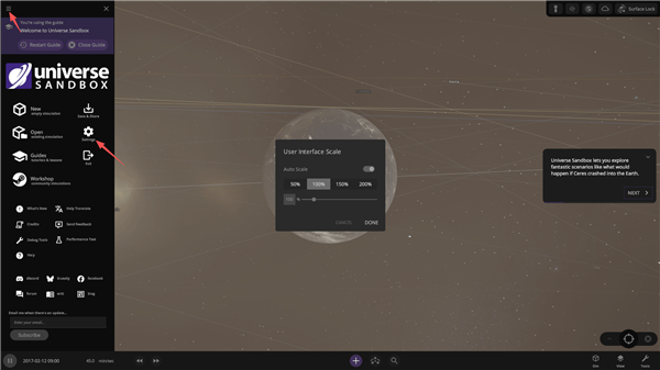 1、双击启动宇宙沙盘游戏,在主菜单点击左上角的扩展按钮-Settings;