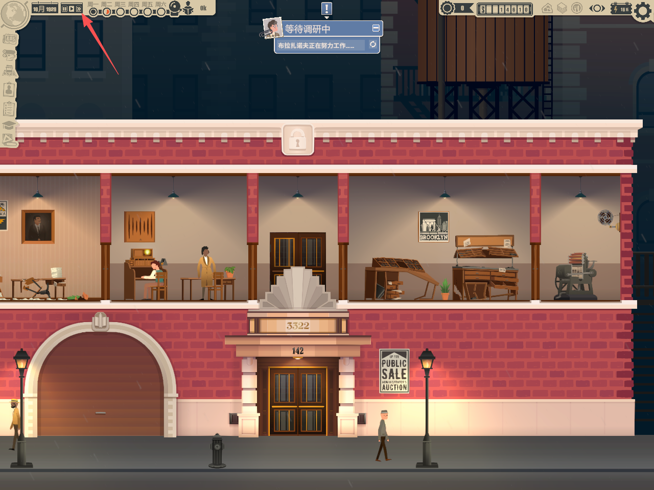 3、随后便是等待调研,可以通过点击屏幕左上角的来加速时间。