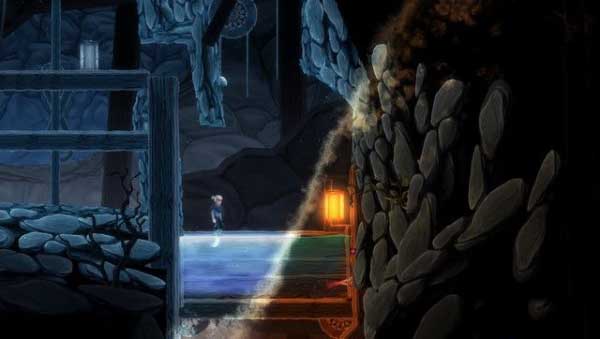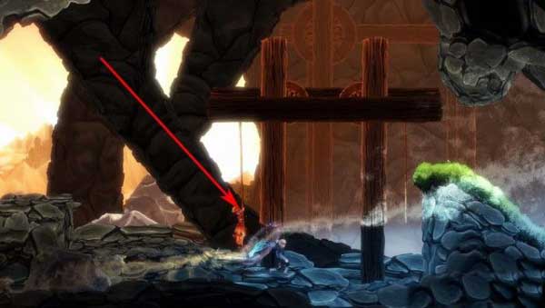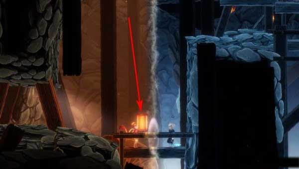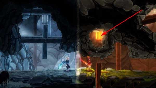 在山洞最开始,如下图箭头所指,这里的灯其实是一个机关,当灯被点亮的时候,旁边的门就会被打开,