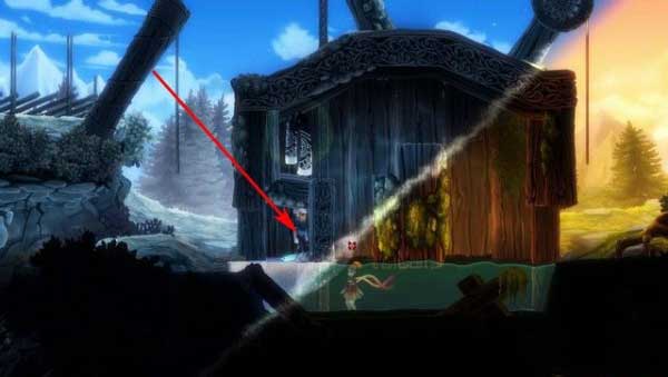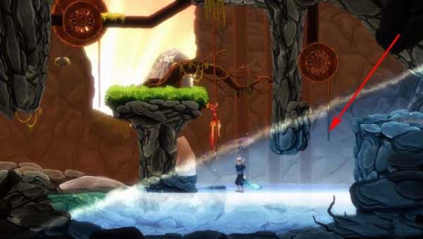 先去木屋的右边,可以发现,在水的另一边藏有收集品。首先,控制冰男到达如下图箭头所指的地方,