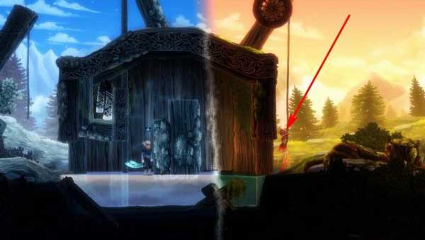 步骤2:切换角色为火女,到达木屋右侧,抓住绳子,使得冰男旁边的暗门打开。随后,冰男往右边前进。