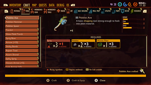 C键打开制作界面,有些物品需要前置的研究。比如斧头,需要石头,植物茎和绳子,而绳子需要小树叶研究出来才能用,当然,在砍草的时候也有概率直接掉落绳子,这种应该就可以直接用了。