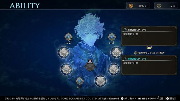 1、能够强化角色的是「能力」。透过使用角色等级提升时获得的「AP」(能力点数),能够提升能力值和攻击速度等等。另外也可以使用持有金钱来重置所有能力并重新分配AP。