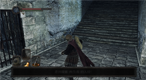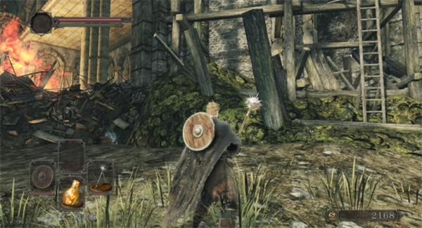 回到高处的城墙,经过一个铁乌龟后,来到很多火药桶的墙壁,勾引上面的火焰壶哥仍火焰壶炸开墙壁打开通往篝火的捷径。