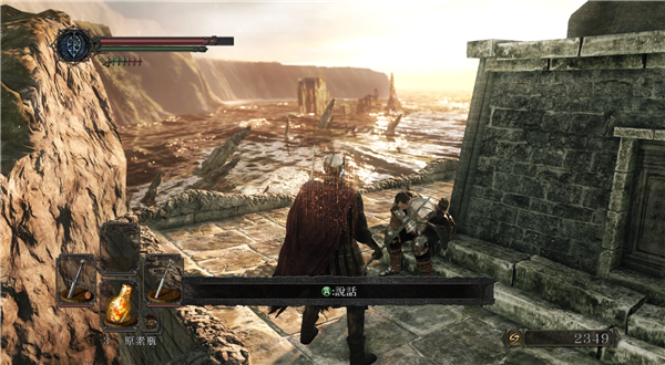 来到旁边悬崖石碑下面,和索丹交谈,他的对话很多,也是类似一代灰心哥的引导NPC,他会给你解释召唤、地上留言、誓约之类的,还会给你指引路线。