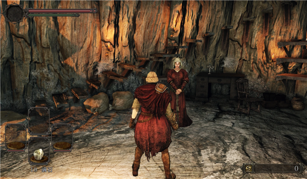继续往前走,在一个阶梯处把龟龟前面的木桶碰下去爆炸后打开一个捷径,里面点燃篝火后,在旁边的房间里可以看到坐在箱子上的铁匠。