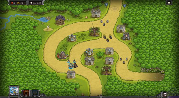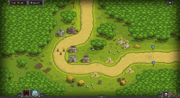 这一关比较简单,一个路口,虽然这关简单,但是策略还是要明确,就是集中火力打击敌人,我们选择这3个位置布置防守,有个炮塔基本就足够了,可以炮台 魔法塔 箭塔组合,双箭塔也可以,关键是把炮放中间,发挥火炮的最大优势,小兵就摆3个火力的中间位置,挡住来犯之敌后,3个火力点就有足够的时间进行打击,轻松搞定!!