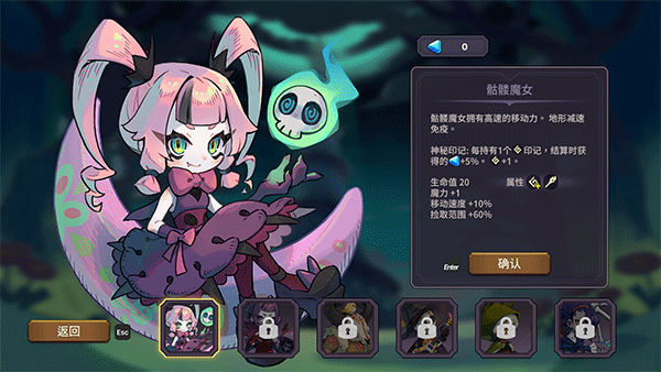 3、完成后返回主菜单点击"开始游戏",选择确认初始角色骷髅少女,更多角色待后续解锁体验。