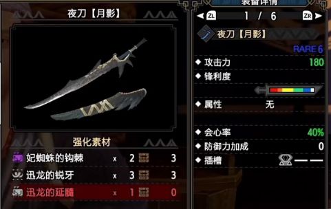 之后就是打上位的迅龙了,迅龙的太刀就算是当前版本的毕业武器之一了,夜刀【月影】,攻击力180,有白色斩味,蓝斩也是十分高,会心有40%。