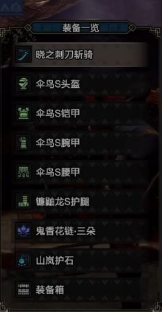 之后还是一样,打到上位的伞鸟之后,可以做一把晓之刺斩骑的太刀,配一套上位伞鸟S装备可以有纳刀术3的技能,纳刀是这作太刀输出的核心技能,所以纳刀术3是必须配的。