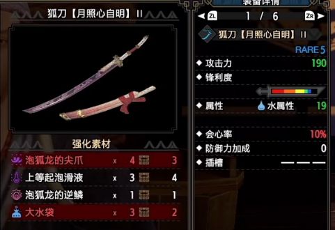 还可以做一把泡狐龙的太刀,狐刀【月照心自明】,攻击力190,水属性的,可以打一些弱水的怪物。
