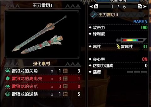 之后就是打到上位的雷狼龙,刷出王刀雷切2,这一把武器是雷属性的,可以用来打弱雷的怪物。