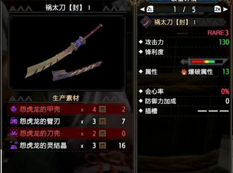 这两把太刀完全就可以用到怨虎龙,打到怨虎龙这个怪物的话,可以做祸太刀,攻击力130算是非常高了,外加上还有爆破属性,如果在一个地方积累了爆破属性的话,最后会爆破,一下估计有100的血,很可观了。