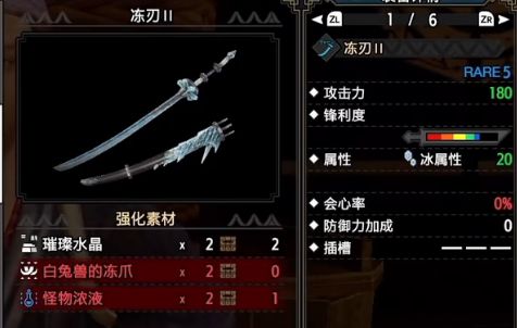 还可以做一把冰系的武器,冻刃2,这把武器冰属性20,攻击力180,重点是非常好做出来,因为弱冰的怪物还是很多的,比如火龙毒怪鸟一些怪。