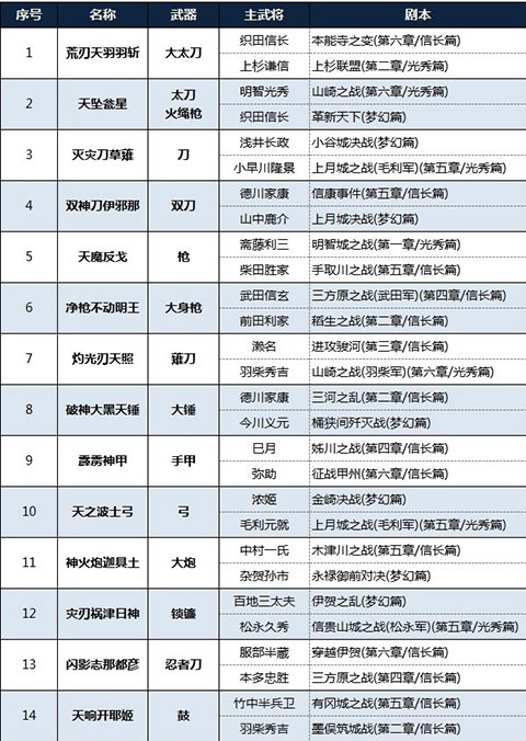 ③需用下方表格内的主武将来通关对应剧本,并全部获得S评价(不必同时获得,多打几次只需每一项都获得过S评价即可)。