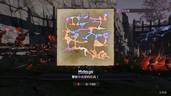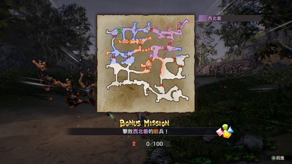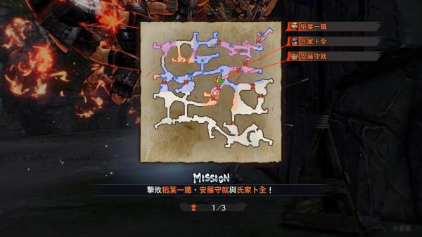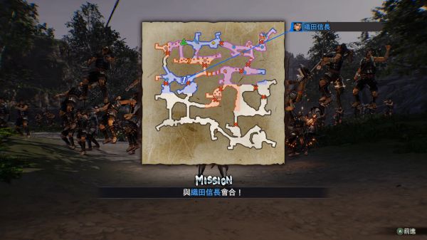 不同的是,光秀篇的地图新增了左上角的地图。这里要先去左上角击败一个大众脸武将,触发【通过山路】任务,完成后不要急着向下走去和信长会合。