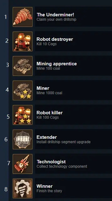 4、Miner,要求挖1000煤。这个成就需要一些的时间,每个地图都有煤矿,每次能挖到200左右。在地下,用钻机钻来的也算。但从COG那抢来的不算。