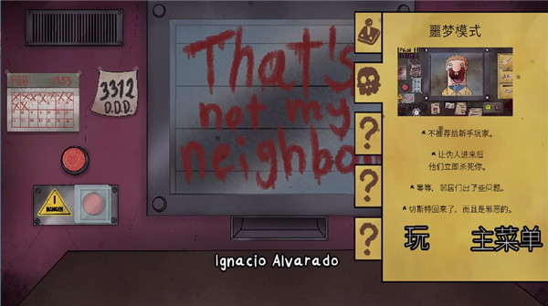 这不是我的邻居是一款引人入胜的新型恐怖伪人辨别游戏。其英文名That's not my Neighbor,又称为那不是我的邻居,甚至被戏称为请出示证件伪人版。在这个游戏中,玩家将成为伪人侦察部(D.D.D.)的一员,扮演一名门卫,你的任务是通过细致入微的身份辨别,将伪人拒之门外。游戏的创新点在于点击式互动玩法,玩家需要根据邻居出示的证件信息判断是否为伪人,如果不是,确认通行;反之,则需迅速点击下方的红色锁形按钮,并拉响警报按钮,源源不断地制止伪人入侵。