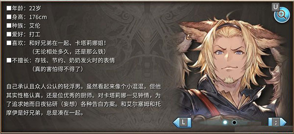 在餐厅打工时,对来店的卡塔莉娜一见钟情,冲动之下辞职,并死缠烂打成为了古兰的骑空团一员(负责烹饪),开启了新的人生。