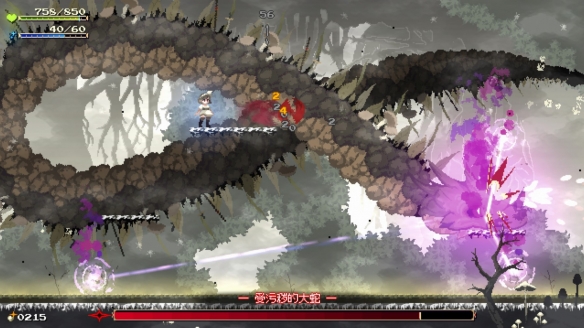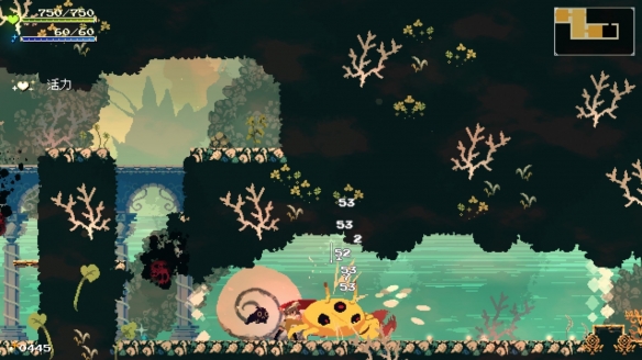 此外,莫莫多拉月下告别的地图探索是本作的核心玩法,不仅仅能够增强主角的战斗力,也是剧情推动的关键,并且游戏的主线剧情并不是强引导而是弱引导,只有NPC对话和地图左下角的一段文字提示至于任务地点位于何方则全靠我们的探索,因此“变强”和“主线”激励着我们探索地图。不仅如此,莫莫多拉月下告别不仅有着精心打造的世界观,还塑造出了绝佳的探索氛围。对于喜欢和想要尝试类银河战士恶魔城玩家们来说,本作绝对是相当适合用来入门类银河恶魔城游戏的一款绝佳作品。