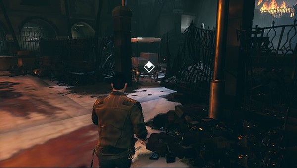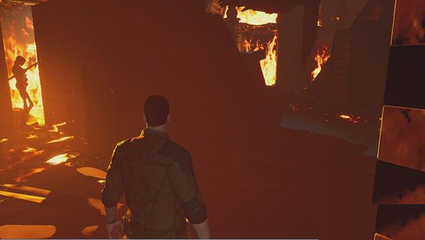 进入着火的房间,前面是一个烧焦的尸体,而右边就是出去的路。