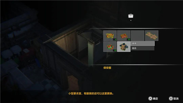 1、去保安室(头胞+酒精组合成汽油,把机器推左边、右边)找到保安服后,房子傍边有个木板,找到更衣室换保安服