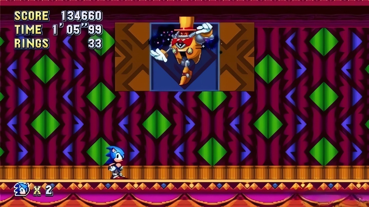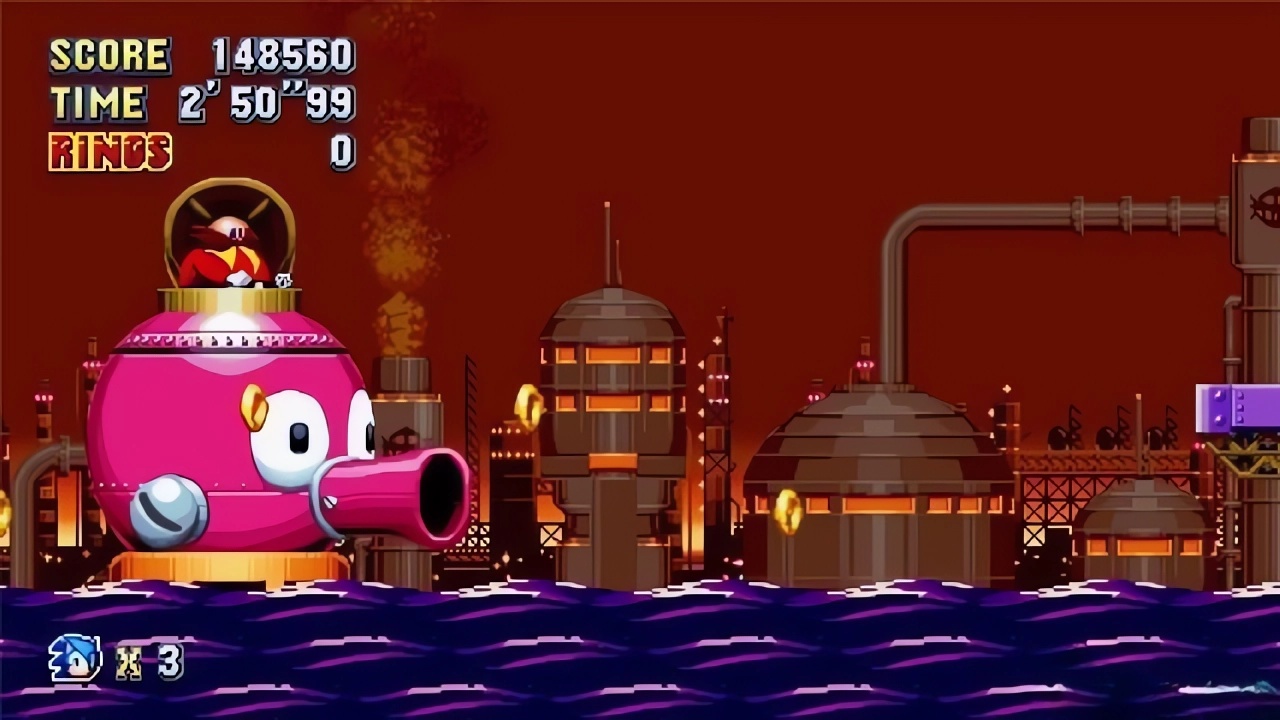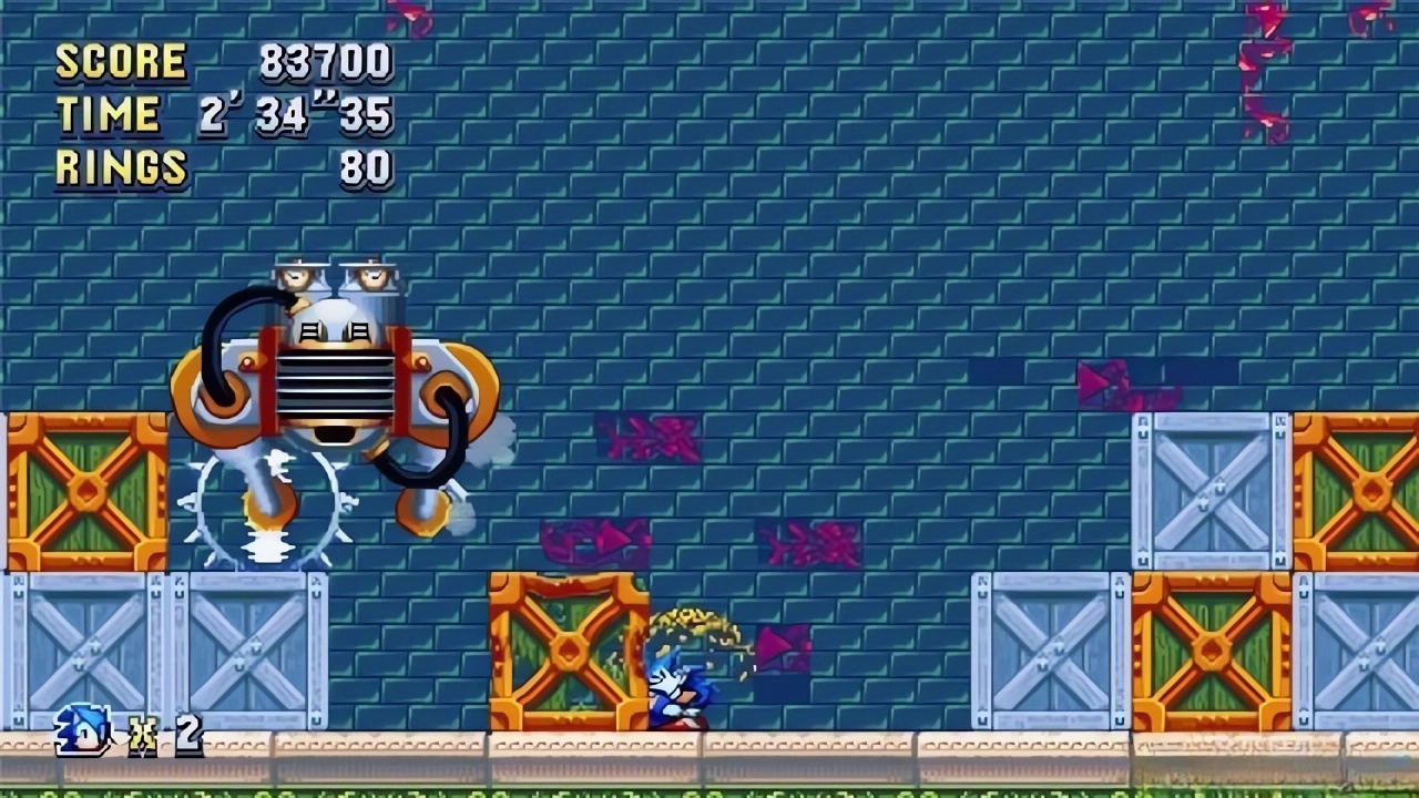 2、1-2的BOSS也是相当简单,虽然是来自SONIC2的最终BOSS,但实际上这货可以说是弱化的相当弱了,只要第一时间跑到我这个位置就能轻松的撞击击败他。