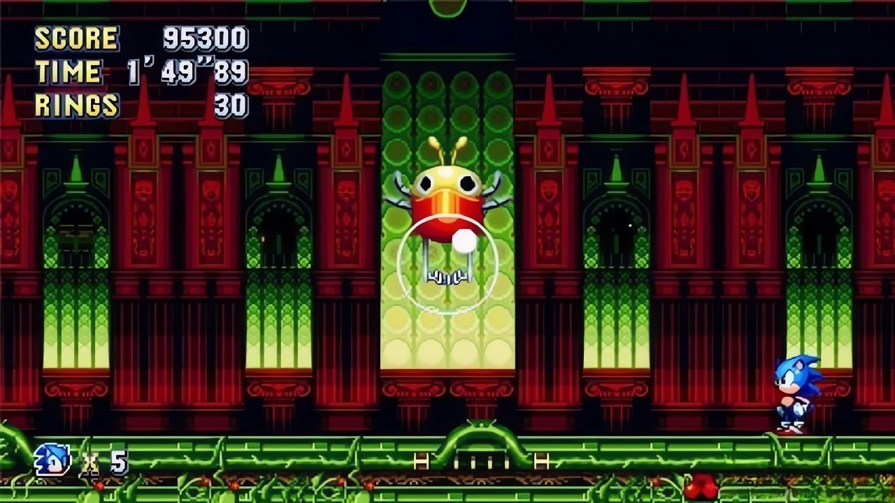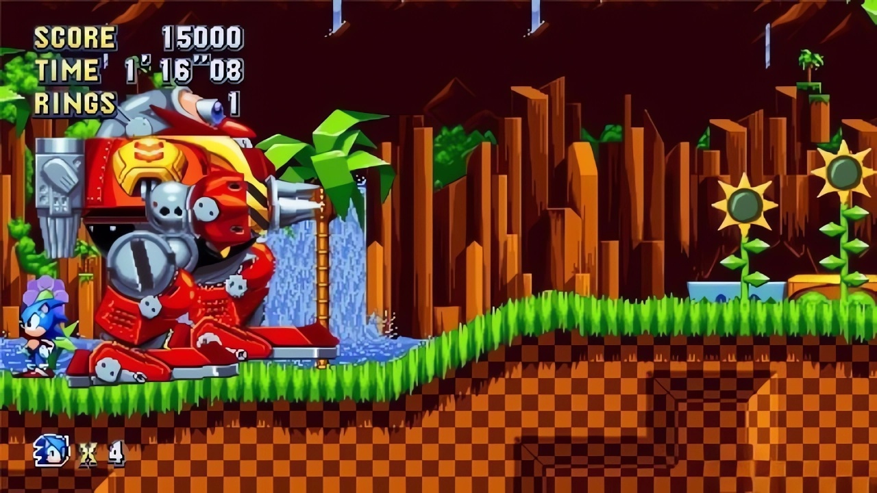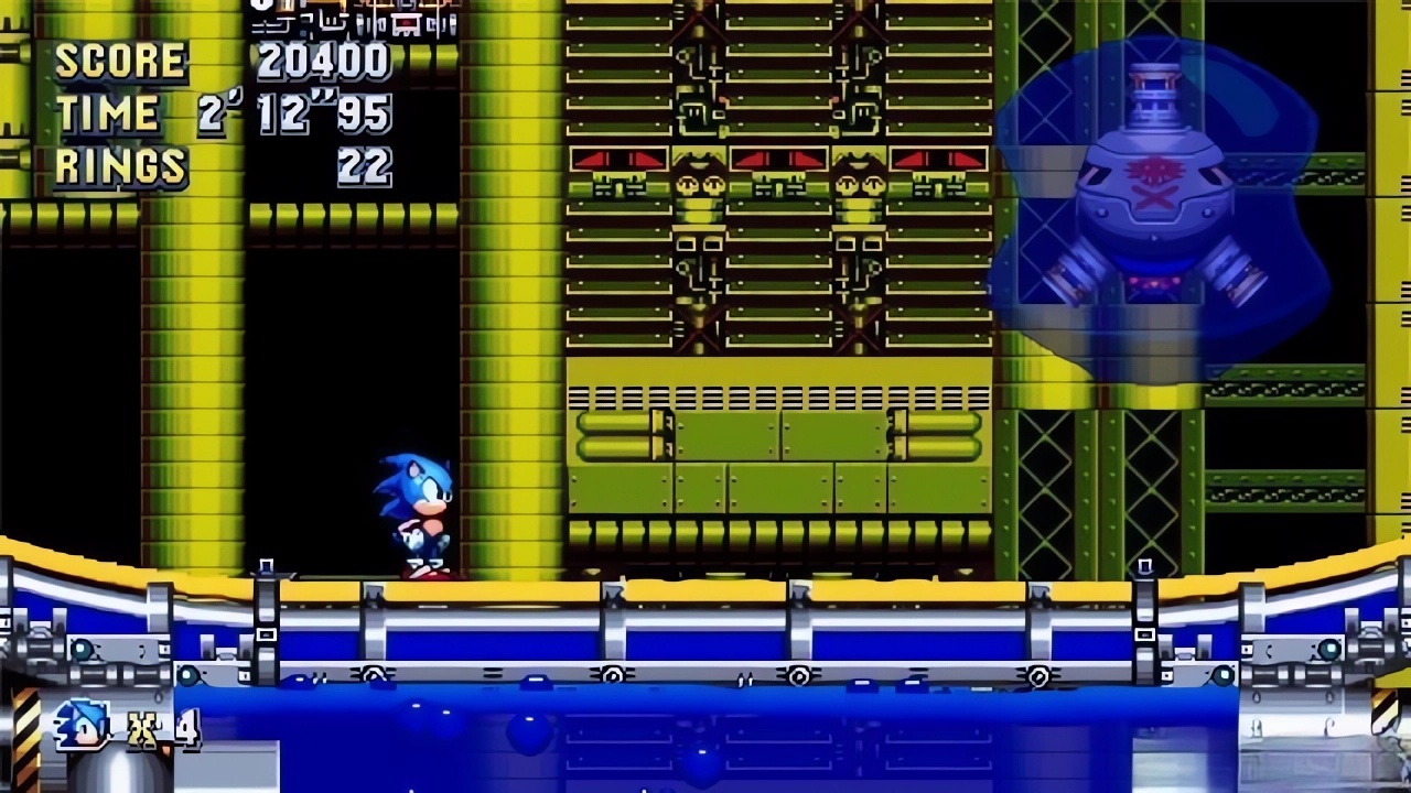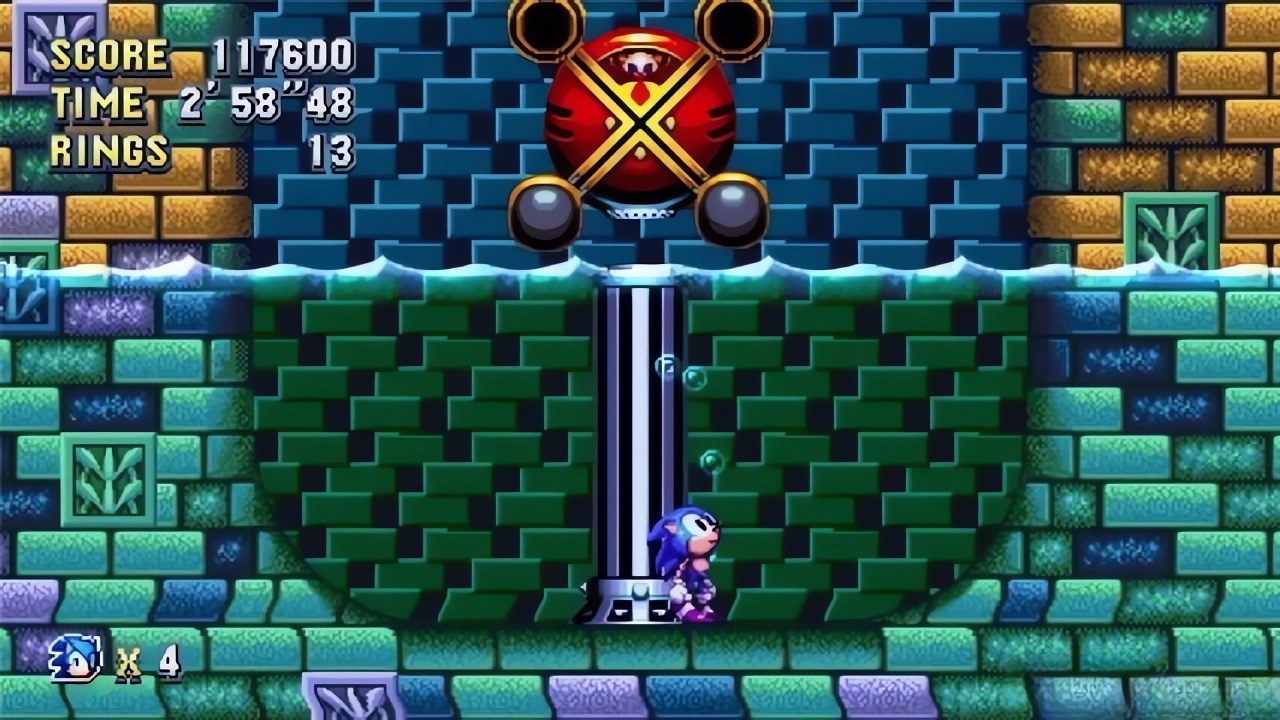2、1-2的BOSS也是相当简单,虽然是来自SONIC2的最终BOSS,但实际上这货可以说是弱化的相当弱了,只要第一时间跑到我这个位置就能轻松的撞击击败他。