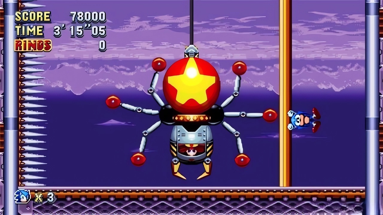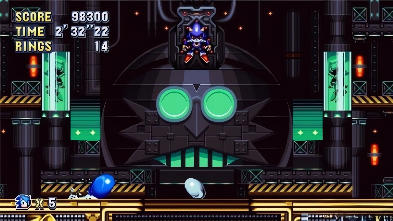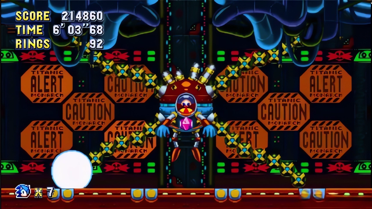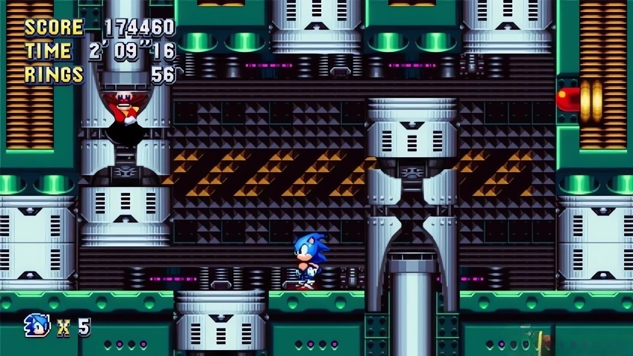 4、而整个SONICMANIA最难的BOSS我想应该就是这货,在这里很很可能会被挤压致死。比较安全的打法是在它第一次出现后马上给它2-4下伤害,然后等他的触手放3次激光后它再次出现后立即跳到最边缘的台子上就不会被挤压死,然后再攻击就好。