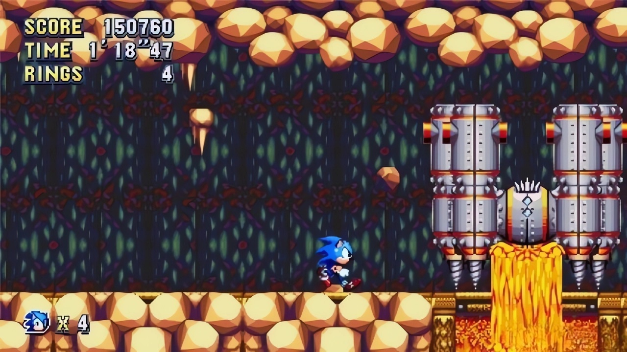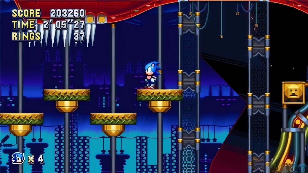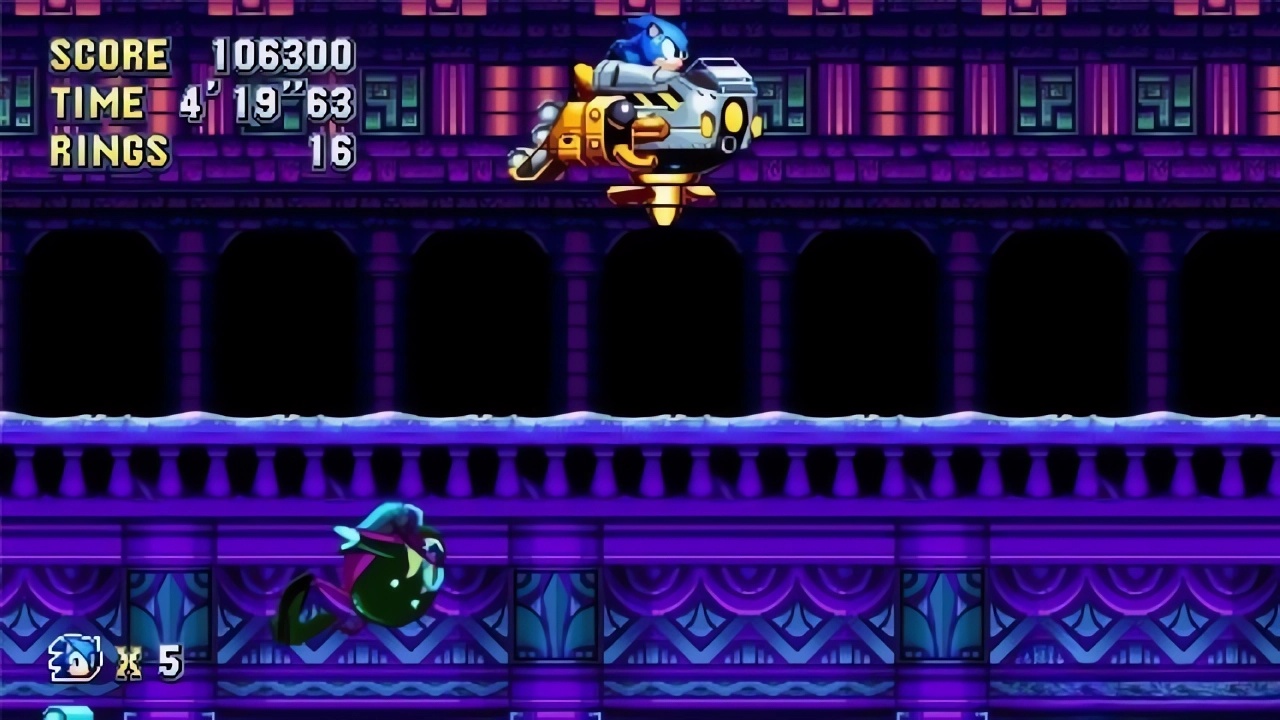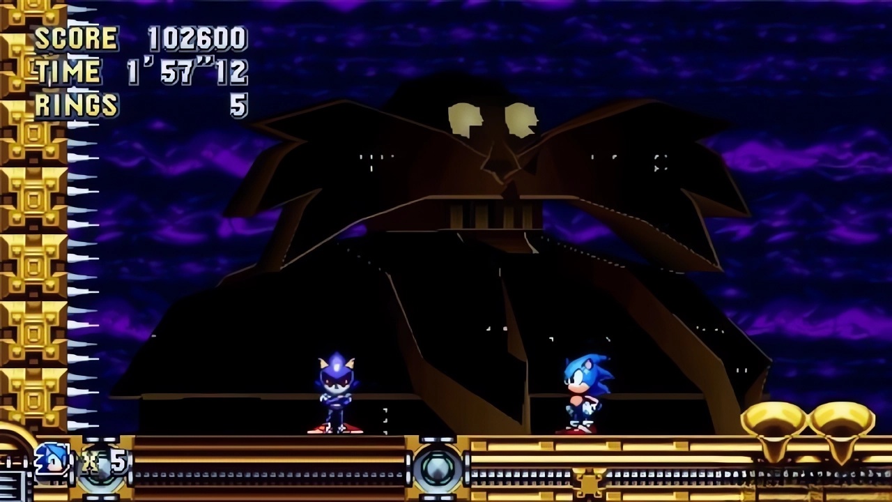 4、而整个SONICMANIA最难的BOSS我想应该就是这货,在这里很很可能会被挤压致死。比较安全的打法是在它第一次出现后马上给它2-4下伤害,然后等他的触手放3次激光后它再次出现后立即跳到最边缘的台子上就不会被挤压死,然后再攻击就好。