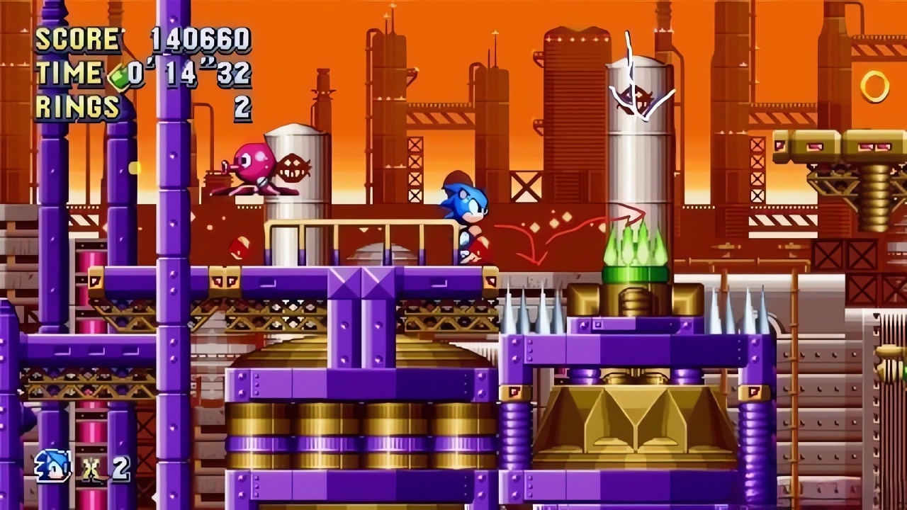 1、整个OOZ最恶心的地方就是这种陷阱,如果你不小心碰到尖刺的话,索尼克会产生一个向后的击退,很有可能刚好被白色箭头落下的盖子瞬间砸死。我的建议是凡是这种地方小心谨慎慢速前进就好,如果用的是塔尔斯和纳克,你就要更加小心不要浪。