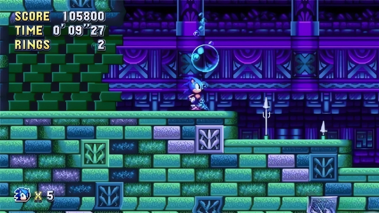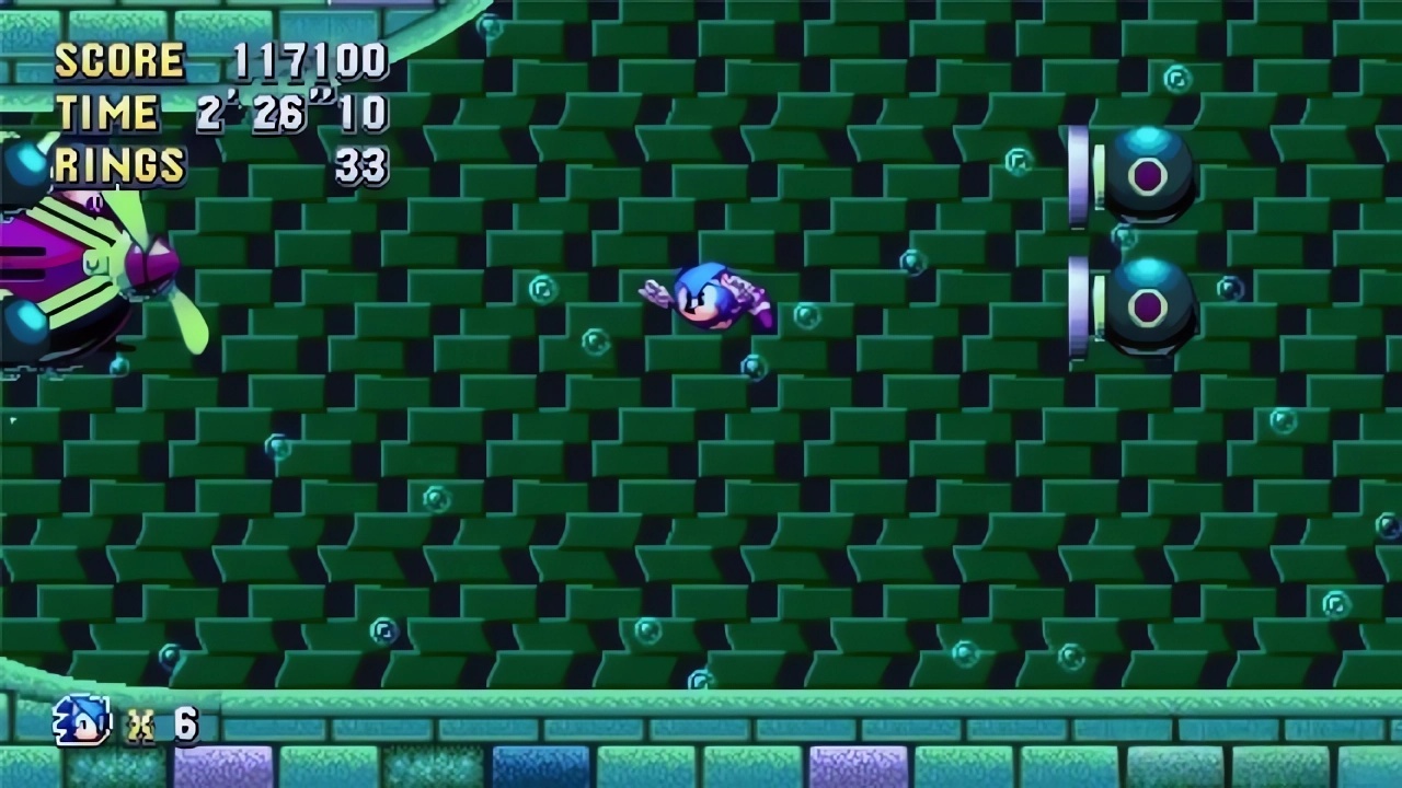 1、2-1的唯一难点就是这种地形,如果是使用塔尔斯的话就相当容易,但是如果是索尼克和纳克就比较难了,这两位都是不会游泳的,而且这里稍有不慎就会被移动的方块挤压致死,这里需要稳和耐心,稍微努力努力就能通过。