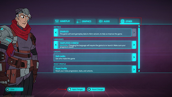 3、来到主界面,点击options,在OTHER,在ANGUEGES选项中,向左两次到简中,APPLY CHANGES,就是简体中文了;