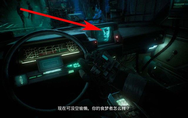 如下图箭头所指,将准星对准车内的显示屏,然后按鼠标左键进行互动。
