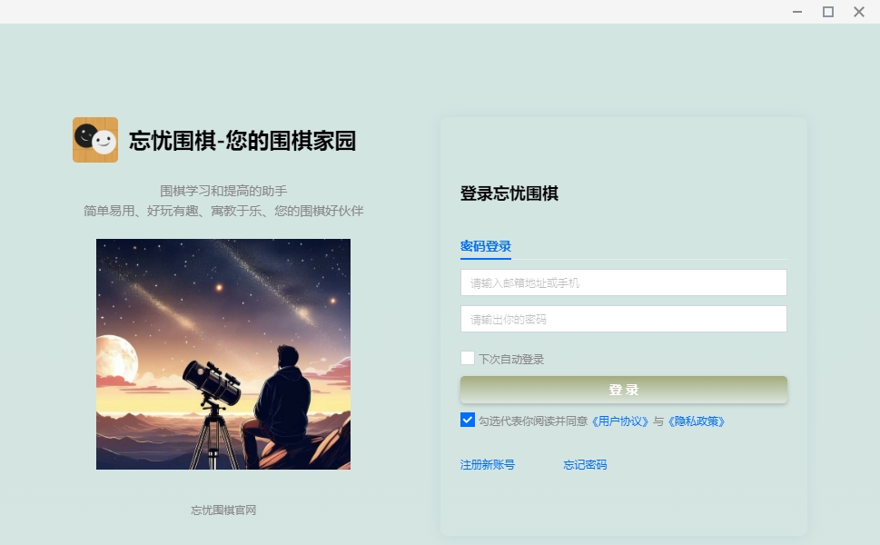 忘忧围棋电脑版是专为windows系统所打造的一款围棋桌游,游戏所包含的玩法十分的丰富,比如网络对弈、人机对弈、围棋题库、棋谱库、赛事直播和交流区等功能,所以不管你是初学者还是经验丰富的高手都可以从中找到自己的乐趣,而且游戏还提供了云端的棋力计算功能,从入门级职业顶尖级别的人工智能7X24小时陪伴,随时随地都可以找到合适的棋友和你下棋。