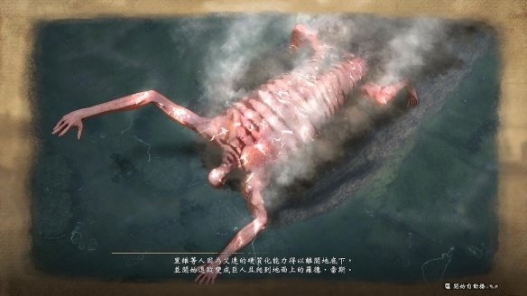 5、失去重心的雷斯倒了下来,同时巨人化的艾伦将炸药扔进了雷斯嘴里。